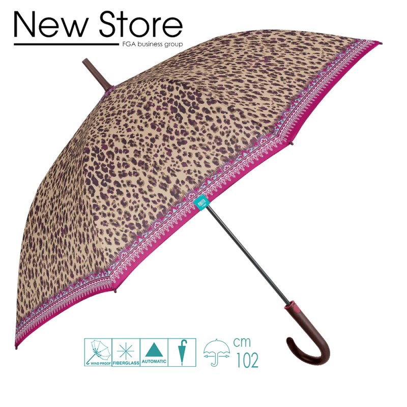 Ombrello donna lungo perletti, fantasia maculato ,beige, marrone, con bordo a contrasto fuchsia