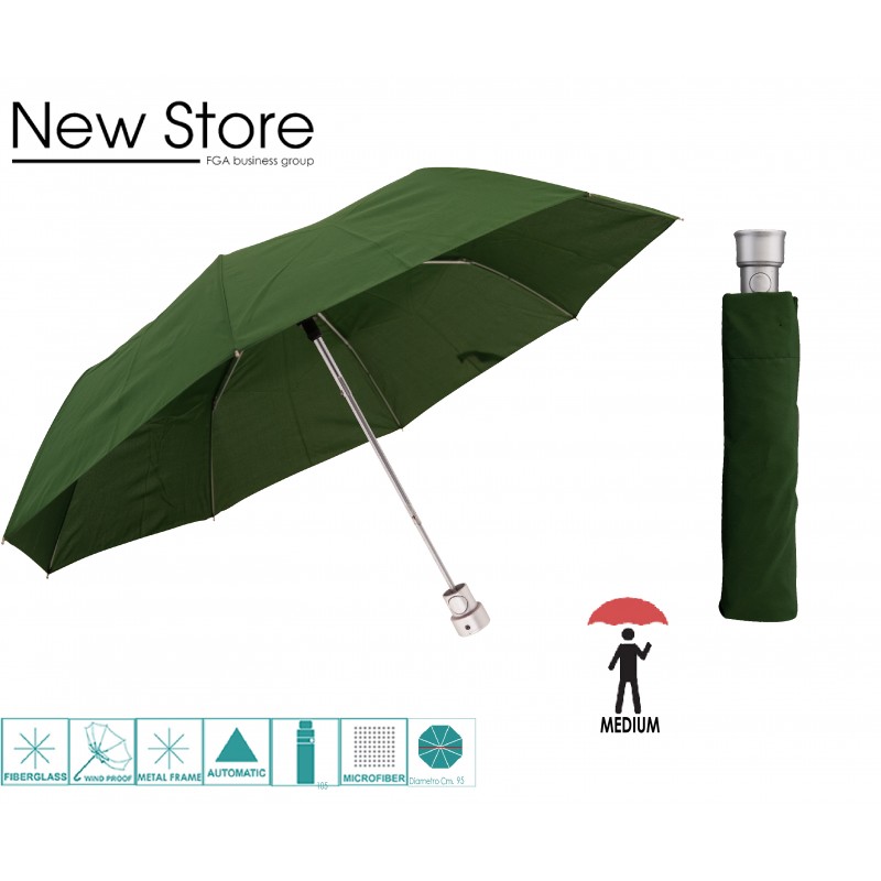 Asta in acciaio,bacchette in alluminio e fibra di vetro,sitema antivento ,apertura automatica, impugnatura colore argento tonda,tessuto microfibra ,diametro aperto cm.95,lunghezza cm.28