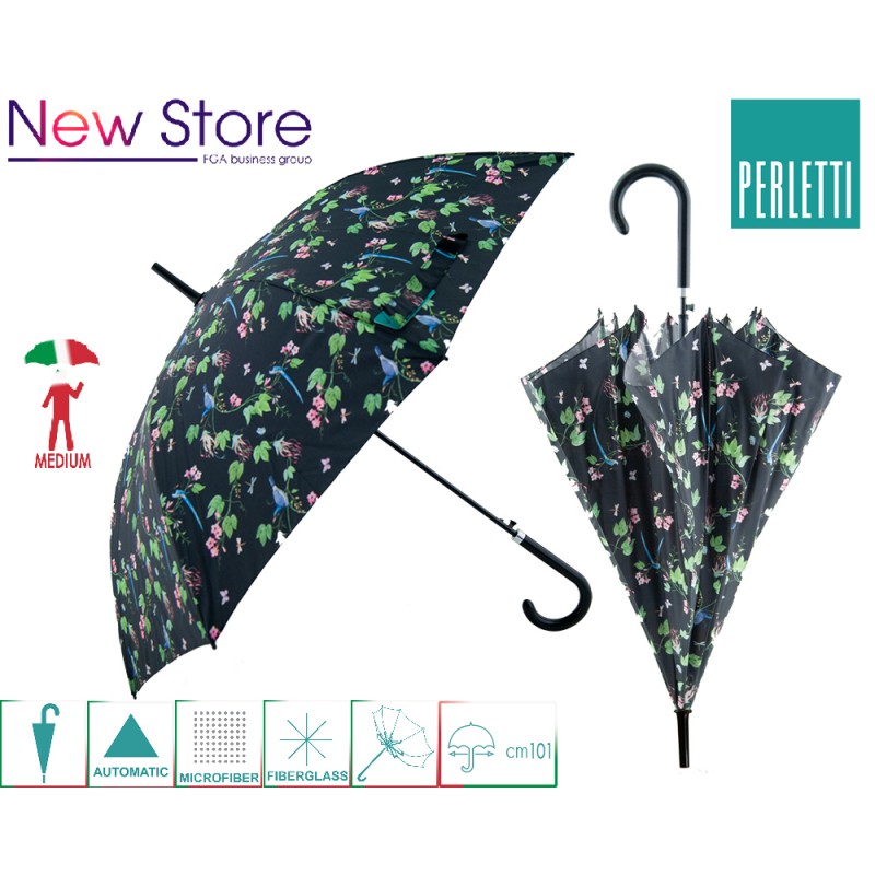 Ombrello donna perletti time lungo,fantasia fondo nero,impugnatura curva ,sistema antivento,struttura in fiberglass,apertura con pulsante automatico,tessuto microfibra idrorepellente