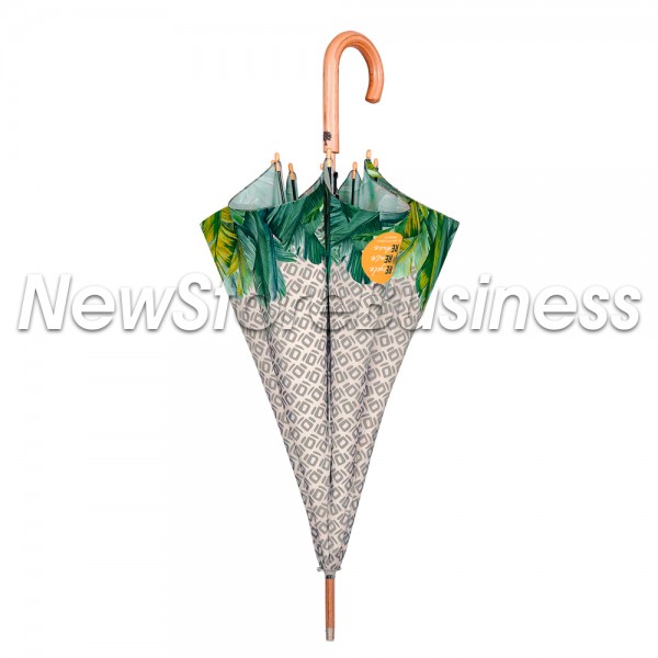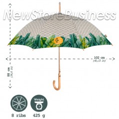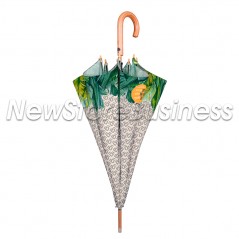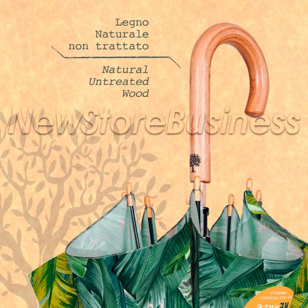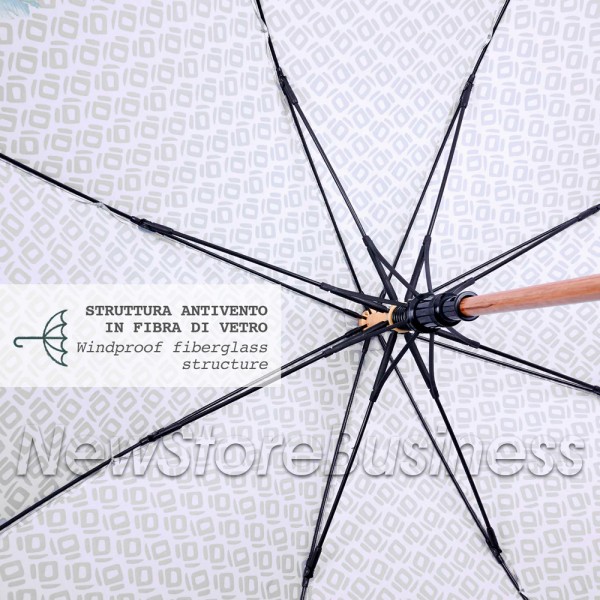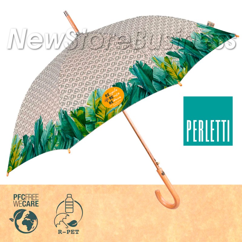 Ombrello donna Perletti realizzato con materiale riciclato,tessuto proveniente da bottiglie di plastica,impugnatura e asta in legno naturale non trattato,bacchette flessibili in fibra di vetro, antivento,super idrorepellente,resistente per un futuro ispirato alla natura