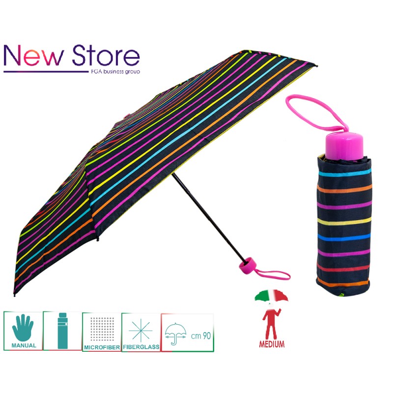 ombrello da borsa multi righe colorate super leggero ,impugnatura a contrasto verde fluo,fuxia fluo,blu elettrico fluo