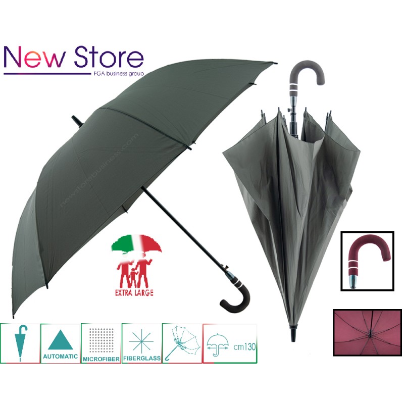 Ombrello Golf Unisex, extra large, struttura interamente in fiberglass, colore unito blu,nero,bordeux,grigio,sistema antivento,tessuto in microfibra,impugnatura curva in eva,apertura con pulsante automatico