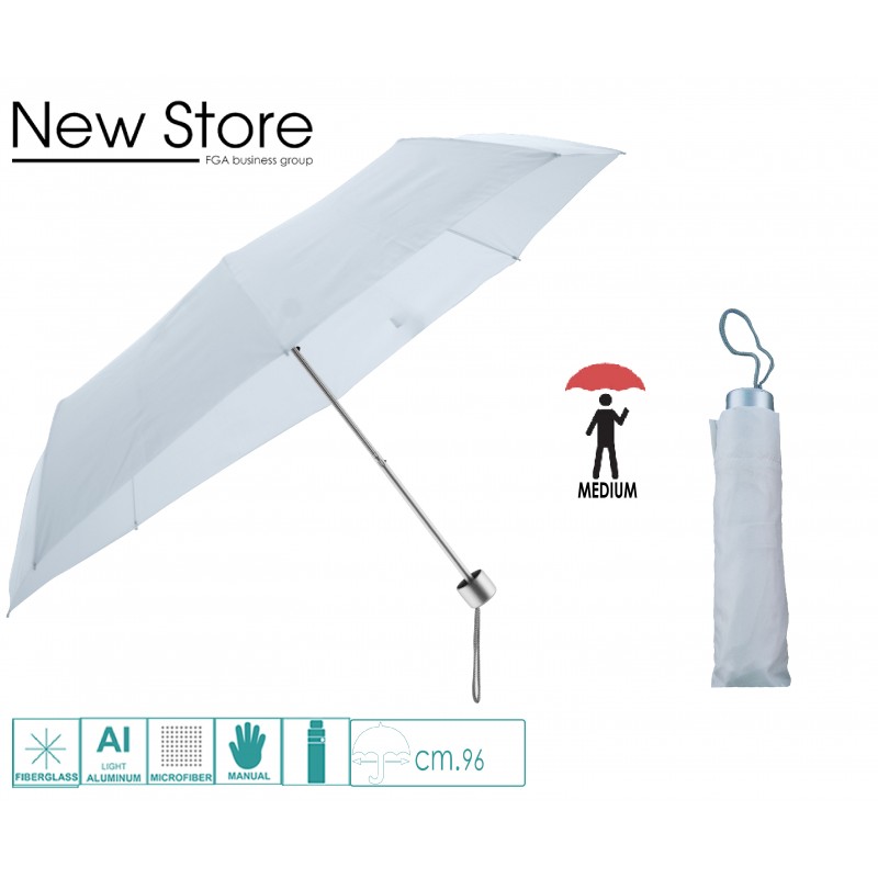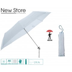 Piccole dimensioni tascabile,24 cm. di altezza,diametro cm.98,tessuto poliestere setinato idrorepellente,impugnatura tonda in pvc colore argento,sistema di apertura manuale,antivento