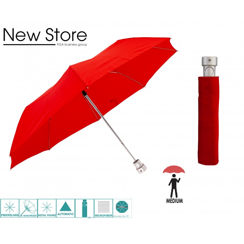 Asta in acciaio,bacchette in alluminio e fibra di vetro,sitema antivento ,apertura automatica, impugnatura colore argento tonda,tessuto microfibra ,diametro aperto cm.95,lunghezza cm.28