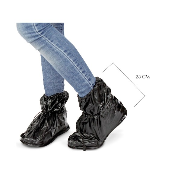 Pratico salvascarpe da portare sempre in borsa o in macchina nelle giornate cupe d'inverno. Facile da indossare su qualsiasi tipo di calzatura anche le scarpe con i tacchi data la suola e talloniera rinforzata. Protegge dalla pioggia, dal fango e dalla neve grazie alla suola antiscivolo. Altezza 25 cm colore nero.