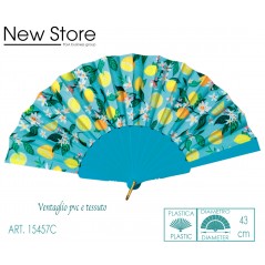 Ventaglio plastica e tessuto tema agrumi, impugnatura colore verde acqua, tessuto con immagine limoni giallo