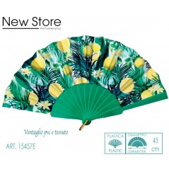 Ventaglio plastica e tessuto tema agrumi, impugnatura colore verde mela tessuto con immagine limoni giallo e verde