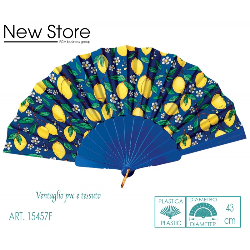 Ventaglio plastica e tessuto tema agrumi, impugnatura colore blu tessuto con immagine limoni giallo e verde